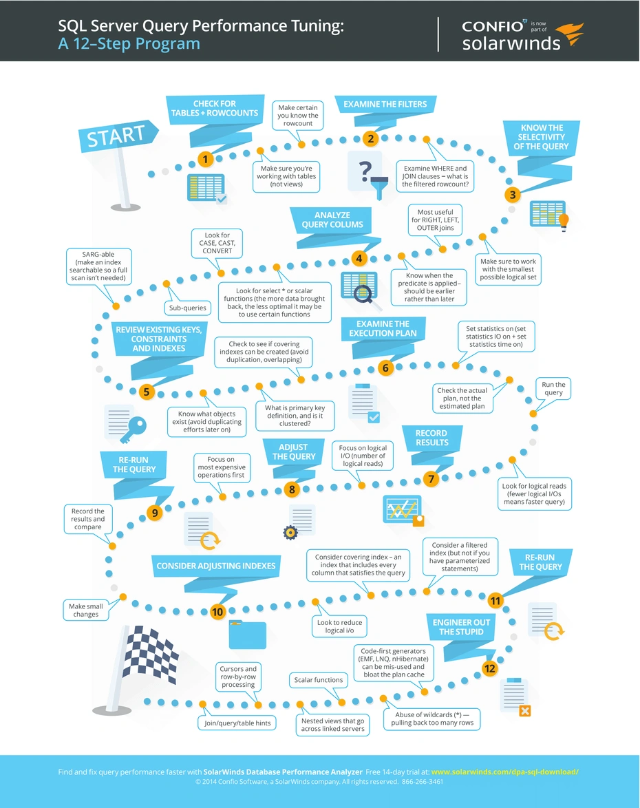 Check the Execution Plan: Most databases provide some facility to display the optimization strategy or plan that will be used. This will tell you if a fast index or primary key search will be used instead of a slow full table scan. For Sybase and Microsoft SQL Server use ISQL and the set showplan on command. For Watcom SQL use the plan() function as follows: